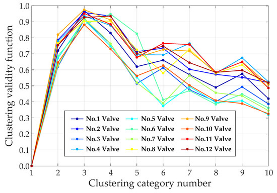 We first used the 12 training sets of the 12 converter valves to calculate the value of the clustering validity function according to Equation (25). We let the category number traverse from 1 to 10, and the results for each converter valve are shown in Figure 9. For valves No. 6 and No. 12, the values of the clustering validity function corresponding to were marginally greater than those for , and for the other converter valves, the validity of the clustering results was the highest when . Therefore, the optimal clustering number was set to 3 for this case.