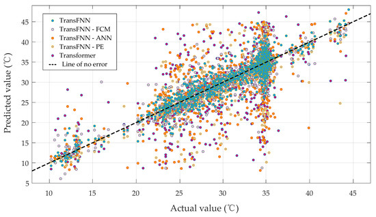 For the sake of clarity, converter valve No. 7 was chosen to display the illustrative results, as shown in Figure 10, and we also present a scatterplot of the measured and predicted values of the valves’ cooling water temperatures in Figure 11.
