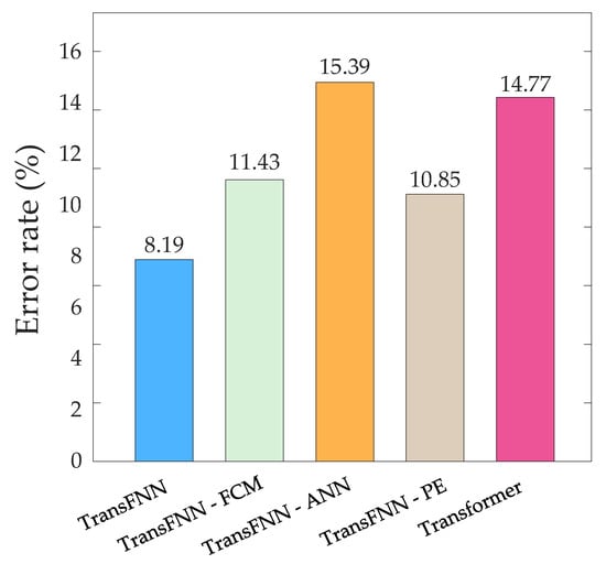 A converter valve will be in an overtemperature state if the valve’s cooling water temperature exceeds a threshold. In order to evaluate the accuracy of the five models in predicting the overtemperature state of a converter valve, we preset the threshold of the cooling water temperature to 38 °C. When the converter valve was actually in the overtemperature state but the cooling water temperature of the valve did not exceed 38 °C or when the converter valve was not in the overtemperature state but the predicted value indicated an overtemperature state, the predicted result was considered to be wrong. We counted the error rate of overtemperature prediction of each model on the test sets of the 12 converter valves, as shown in Figure 12. We can see that removing any module from the proposed TransFNN model led to an increase in the error rate of overtemperature prediction, and the proposed TransFNN model improved the prediction accuracy by 6.58% compared with the original Transformer model.