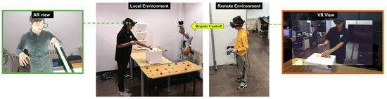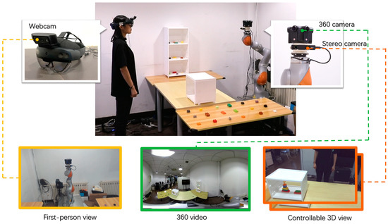 Since the onset of the COVID-19 pandemic, mixed-reality remote collaboration has gained increasing attention. In this type of collaboration, remote users observe the local environment through virtual reality (VR) head-mounted displays (HMDs) and collaborate with local users wearing AR HMDs [1,2,3]. In traditional mixed-reality remote collaboration, the video capture device is typically placed in a fixed position in the local environment [4] or on a local user’s HMD [5], providing a fixed perspective or the local user’s first-person view of the local environment, and remote users cannot actively and freely switch views. In recent research on remote presentations, researchers have mainly deployed video capture devices on wheeled robots [6,7,8] or drones [9,10], allowing remote users to move the viewing perspective by operating these devices. However, these systems have limitations in terms of control freedom and accuracy, which prevent remote users from freely and accurately observing the local environment.