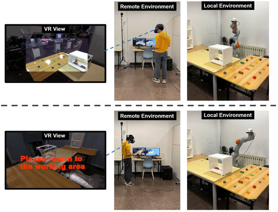 Remote users can control the viewpoint by moving their heads to observe the local space. When the remote user moves beyond the working range of the local robotic arm, the real-time updated stereo video is hidden; the user can only observe the local environment through the reconstructed 3D space but can continue to roam in it. At the same time, a prompt message will appear in the remote user’s field of view, indicating that the remote user has moved beyond the working range of the robotic arm and guiding the user to return to the working area of the robotic arm. When the remote user returns to the working range of the robotic arm, the display of the stereo video turns on and continues to provide the remote user with a real-time stereo view of the local space.