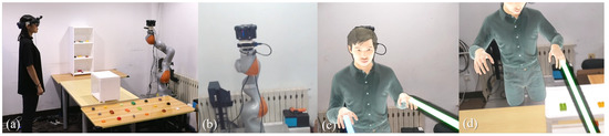 (a) The local user and the robotic arm and camera installed in the local environment. (b) The real environment in the local user’s view. (c,d) The avatar and rays superimposed on the robotic arm in the local user’s view through AR.