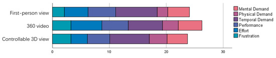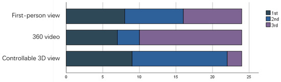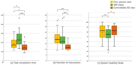 For the task completion time, we used a one-way repeated-measure ANOVA, which showed that the three conditions of first-person view, 360 video, and controllable 3D view differed significantly in task completion time (). Analyses with pairwise comparisons showed that significant differences existed between the conditions of first-person view and 360 video (), first-person view and controllable 3D view (), and 360 video and controllable 3D view ().