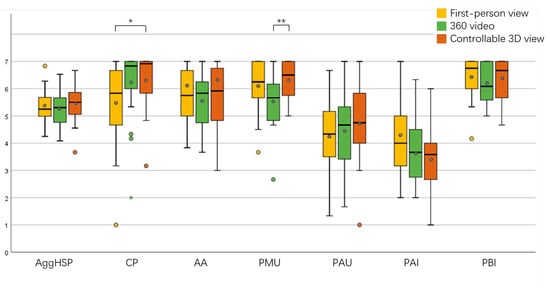 The results for the sense of social presence are shown in Figure 8. Based on our results, there were no significant differences in aggregated social presence scores across the conditions, but there were significant differences in copresence (, ) and perceived message understanding () between conditions. Pairwise comparison analysis revealed significant differences in copresence () between the first-person view and controllable 3D view and in perceived message understanding () between the 360 video and controllable 3D view, and no significant differences existed between the remaining conditions.