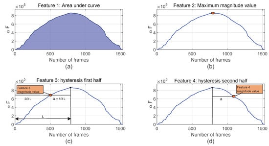 Proposed features for the moment  and the object #OBJ-2 (potato): (a) area under the curve ( feature), (b) maximum value ( feature), (c) magnitude value in the ascending part at  of the time to reach the maximum ( feature), and (d) magnitude value at  of the same time after the maximum is reached ( feature).
