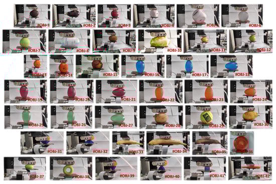 We selected 42 objects with different shapes and compliances (see Figure 4 and Table 1), which were grouped into four sets. The first set consisted of 3D printed objects (#OBJ-7, #OBJ-31, #OBJ-32, and #OBJ-37 to #OBJ-41) made of the flexible thermoplastic materials Filaflex® and TPU®. The second set comprised hand-therapy grip 3D ovoids of varying stiffness (#OBJ-16 to #OBJ-18 with middle-high stiffness; #OBJ-19 to #OBJ-21 with high stiffness; #OBJ-22 to #OBJ-24 with low stiffness; #OBJ-25 to #OBJ-27 with middle-low stiffness). The third set consisted of objects selected from real-world scenarios (#OBJ-4, #OBJ-5, #OBJ-6, and #OBJ-29), some of which were used in different positions. Last, to consider applications such as smart agriculture and food processing, we included 17 pieces of fruits and vegetables in varying states of preservation: immature, mature, or rotten (#OBJ-1, #OBJ-2, #OBJ-3, #OBJ-9 to #OBJ-15, #OBJ-28, #OBJ-30, #OBJ-33 to #OBJ-36, and #OBJ-42).