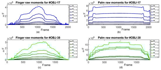 Once the experiments had been performed with the 42 objects shown in Figure 4, we obtained the first six raw moments curves for the tactile images (1) of these objects. Figure 6 displays the example six first raw moment  curves for the finger and palm and for the #OBJ-17 and #OBJ-38 objects in Figure 4 and Table 1, respectively.