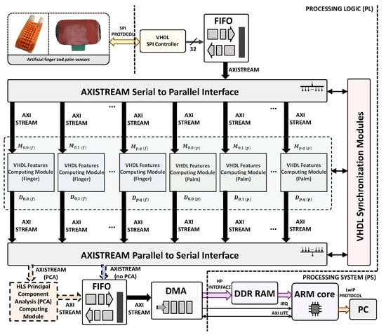 The Vivado Design Suite™ environment was used to implement the preprocessing modules in Figure 7). This software integrates a hardware-description code written in VHDL/Verilog, as well as presynthetized cores from IP libraries or from the High-Level Synthesis (HLS) tool. The VHDL Features Computing Module blocks produce synchronized output data () for the finger and palm, respectively. These data are then transmitted to an AXISTREAM Parallel to Serial Interface through the use of the AMBA® AXI-Streaming protocol. The feature vectors are serially transferred to a DDR memory for storage via a FIFO buffer and a DMA module. This setup allows the ARM core to access the stored data without having to manage data traffic. The FIFO output module allows frequency decoupling between the processing logic (PL) and processing system (PS) parts.