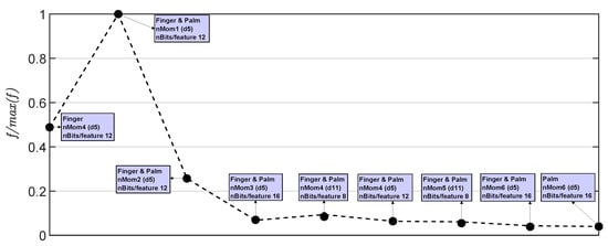 In order to determine the best implementation, we needed to consider different combinations of sensors (finger, palm), features (see Table 2), numbers of image moments per sensor, and bits per feature. Matlab® was used to obtain the results in Table 3, which shows the highest accuracy percentage achieved without PCA, for different combinations of  moments, features, and bits per feature (nbits/feature), respectively.