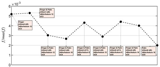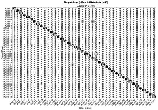 Figure 13 shows a comparison of the cases in Table 6 with the figure of merit defined in (2). The best case now was Finger&Palm, nMom1 (d5), nBits/feature 12, nC3 and its corresponding confusion matrix is displayed in Figure 14.
