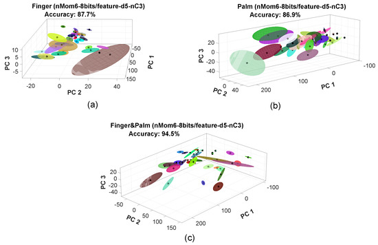 Figure 12 shows a comparison in three-dimensional feature space with three principal components, when the finger, palm, and finger–palm were used. In all cases, six moments were used, the d5 feature was applied, and there were 8 bits per feature. The training sets for each class in Figure 12 are represented as Gaussian ellipsoid distributions. The centroid of each class, a 3-value array, was determined through the training procedure outlined in Section 3.5. The classes in Figure 12c are more separated from each other than in Figure 12a,b; therefore, the classifier was more accurate when it received information from multiple sources. This can be seen in Table 5 and was also observed when PCA was not applied, as mentioned in the previous section.