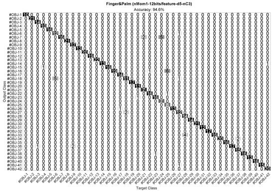 The confusion matrix for the best case Finger&Palm (nMom1-12bits/feature-d5) in Figure 10 is depicted in Figure 11. This confusion matrix shows that this implementation accurately classified the 42 objects in Figure 4, reaching an accuracy of  in our experiments. Despite the large size of the test set (673 feature vectors), there were only a few misclassifications.