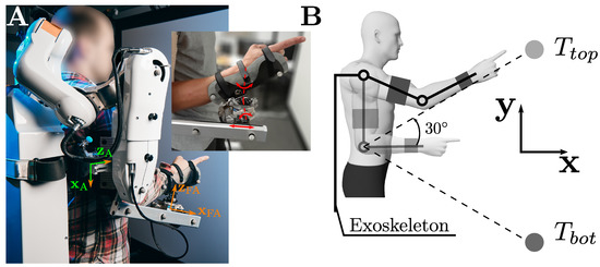 The task was composed of reaching movements in a sagittal plane toward two semi-spherical targets. Reaching tasks in a sagittal plane have been widely studied in the rehabilitation literature, and exoskeletons may be of potential help for this kind of application [43,44,45,46]. Before movement onset, participants were asked to remain static in a reference position, i.e., with the arm remaining vertical and the forearm horizontal. Then, one of the two targets was lit for , which allowed the participant to perform the movement toward the target at a comfortable and self-selected pace without being able to anticipate. After this duration, the target was turned off and the participant was asked to return to the reference position. A total of 30 reaching movements were performed. Half of these movements were performed toward a target higher than the reference position (referred to as , aligned above the reference position, as in Figure 1B) and the other half toward a target lower than the reference position (referred to as , aligned below the reference position). This allowed assessing possible different constraints applied by the exoskeleton at the extremities of the large workspace. The sequence of reaching movements was pseudo-random.