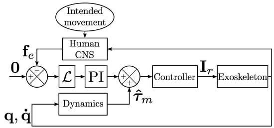 The exoskeleton was controlled in a transparent mode, which means that interaction efforts were minimized to minimize the possible alterations of human movements [34,35]. The controller was based on the identification of the exoskeleton’s dynamics, performed following previous procedures [36], coupled to a force feedback minimization [47]. More precisely, the controller was structured as detailed in Figure 2, which corresponds to the following equation,