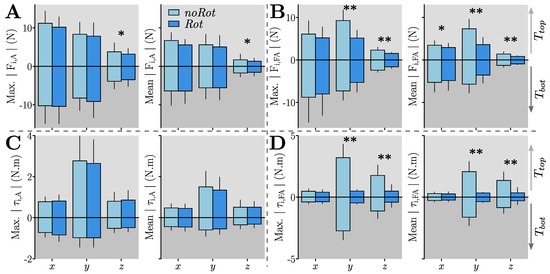 Maximum and averaged interaction effort components (i.e., ) at the level of the arm () and forearm () for both the Rot and noRot conditions. movements are represented with positive values and movements are represented with negative values. Significant ANOVAs on the tested conditions are represented by “*” if and by “” if . (A) Components of the interaction force at the arm. (B) Components of the interaction force at the forearm. (C) Components of the interaction torque at the arm. (D) Components of the interaction torque at the forearm.