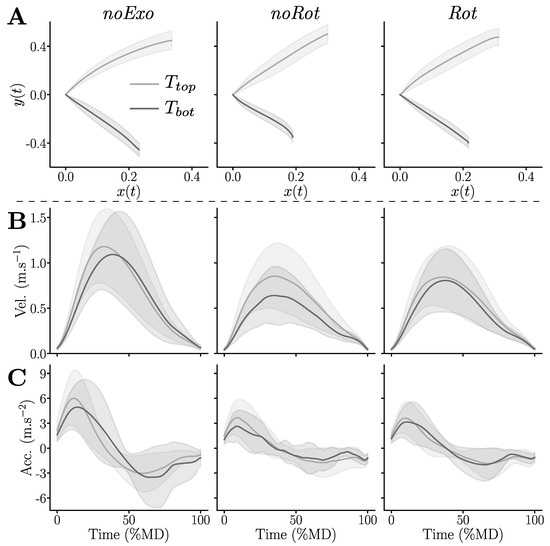 Mean acceleration (): The conducted pairwise comparisons exhibited an overall lower in the noRot and Rot conditions than in the noExo condition (in both cases: , ). Target-based comparisons revealed a lower in the noRot and Rot conditions than in the noExo condition for (in both cases: , ) and a lower in the Rot condition than in the noExo condition for (, ). To summarize, both conditions performed inside the exoskeleton tended to reduce ; the effect was more pronounced for than for . Finally, the noRot condition induced a higher impact on than the Rot condition for , with the opposite for .