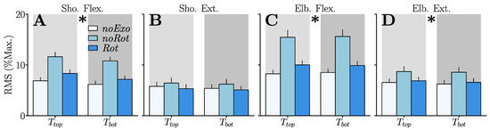 Shoulder flexors: The conducted pairwise comparisons exhibited an overall higher RMS in the noRot condition than in the noExo and Rot conditions (in both cases: , ). Target-based comparisons revealed a higher RMS in the noRot condition than in the noExo and Rot conditions for (in both cases: , ). The noRot condition also induced a higher RMS of shoulder flexors than the noExo and Rot conditions for (in both cases: , ). To summarize, the noRot condition clearly induced higher levels of shoulder flexor activity when compared to the noExo and Rot conditions, as verified independently of the target. Furthermore, the Rot condition did not induce significantly higher levels of shoulder flexor activity than the noExo condition.