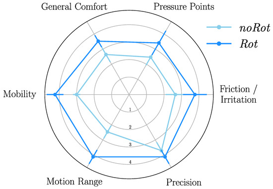 Overall, the grades given by participants were higher for the Rot condition than for the noRot condition, which suggested a better acceptability of the device when including passive rotations. Pairwise comparisons were performed for each of the subjective criterion to confirm or infirm the observed trends. These pairwise comparisons confirmed that the Rot condition induced lower friction/irritation (, ), lower pressure (, ), higher overall comfort (, ), higher mobility (, ), and a higher motion range (, ) when compared to the noRot condition. Finally, the participants did not report a significant difference regarding their subjective movement accuracy between the noRot and Rot conditions.