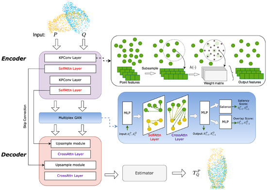 As shown in Figure 2, the encoder is established by alternating KPConv layer and the self-attention layer. Through this approach, we can retrieve the basic multilevel features. The embeddings of point cloud P at the level, denoted by , is derived by