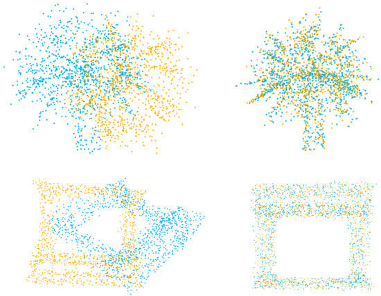 To thoroughly utilize the advantage of attention mechanisms in computer vision tasks, SuperGlue [16] developed a multiplex graph neural network to solve the two-view correspondences problem, where the keypoints are defined as nodes and the connections are defined as edges. The message passing is carried out via alternating cross- and self-attention. As SuperGlue has achieved remarkable results, some studies attempt to adapt this module onto point cloud registration tasks. Since directly using attention mechanisms on raw point clouds tends to be infeasible for large-scale datasets due to the computation cost, refs. [17,18] seeks different sampling strategies to mitigate this issue. Fischer, K. et al. [17] introduced a pillar layer, which encodes a set of dense points by selecting a sparse subset of keypoints. Shi, C. et al. [18] make use of an existing pretrained model [26] to detect keypoints first.