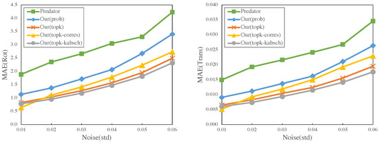 In this section, to evaluate the robustness of our model, we conduct further experiments with additive noise. Given that ICP, FGR, and deepGMR yielded larger errors, we limited the investigation to Predator and our model with different estimators for better comparison. Figure 6 demonstrates the MAE of rotation and translation for different standard deviations of noise. All of our methods achieve better results than Predator under different amounts of noise. We noticed that most of the estimators on our model have similar performances, where the MAE of rotation is less than 3° and translation is smaller than . Another observation is that although in Section 4.2 topk-corres achieves the best results, its performance is slightly worse than topk-kabsch when the amount of noise increases.