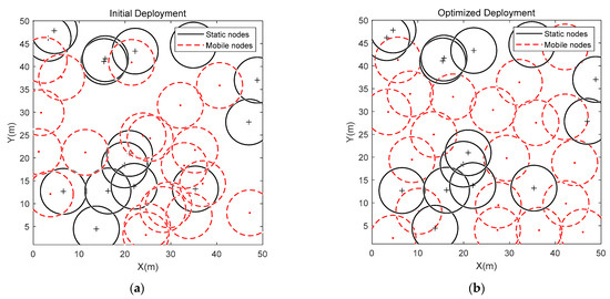 In this section, the sensor nodes were deployed in a square monitoring area of 50 m × 50 m, and the sensing radius of the sensor nodes was 5 m. The maximum iterations was 500, and the number of static nodes and mobile nodes was 15 and 20, respectively. The initial deployment at a static node number of 15 and a mobile node number of 20 is shown in Figure 7a. Figure 7b provides the final deployment of sensor nodes.