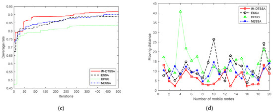In addition, as seen in Figure 6c, the IM-DTSSA algorithm optimizes the network coverage rate from the initial 59.60% to 95.63%, achieving an incremental network coverage of 36.03%. The coverage rate of the NESSA algorithm gradually increases and finally reaches 92.21%, but the coverage rate in the initial stage is lower than that of the ESSA algorithm and IM-DTSSA algorithm. The ESSA algorithm achieves an 89.32% coverage rate when running up to 40 generations but falls into a local optimum in the next 200 iterations. It jumps out of the local optimum at the 240th generation and finally reaches a coverage of 90.59%. The coverage rate of the DPSO algorithm increases but finally only reaches a coverage rate of 88.89%. In terms of convergence speed, the DPSO algorithm converges slowly, improving the network coverage rate by 29.91%. The ESSA algorithm reaches the convergence state quickly, but it obviously falls into the local optimal solution, and takes a long time to jump out of the local optimal. Although the NESSA algorithm finally achieves a high coverage rate and does not appear to be significantly trapped in a local optimum, the convergence speed is slow and the growth rate of the coverage rate is slow. The IM-DTSSA algorithm is able to find the better solution quickly from a lower initial coverage and does not appear to be significantly trapped in a local optimum, and it has a strong performance in finding the best solution as well as jumping out of the local optimum.