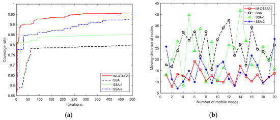 As shown from Figure 8d and Table 3, the average moving distance in the area of 20 m × 20 m is smaller than the moving distance in the areas of 50 m × 50 m and 100 m × 100 m. It is still obvious that the moving distance of the IM-DTSSA is smaller than the three other algorithms.