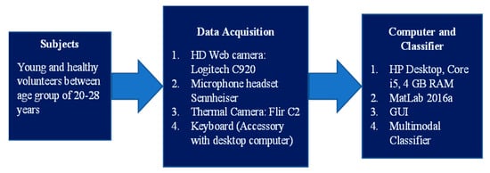 A group of 120 healthy subjects was constituted between 20 and 28 years. They also abstained from caffeine, alcohol consumption, and psychoactive drugs that may influence sleep patterns. All subjects were well informed about the study’s purpose, and we instructed them to fill out a subjective sleepiness scoring questionnaire. Subjects were kept awake for 18 h and called for data acquisition in a controlled environment. When they had taken sound sleep for more than 8 h, the same subjects called again for the baseline (alert state) data acquisition. For consistent circadian rhythm, data was acquired in the morning between 7:00 A.M. to 9:00 A.M. Data acquisition comprises four domains as follows: 1. Visual facial image capturing. 2. Thermal image capturing. 3. Voice acquisition. 4. Keystroke data acquisition. Data acquired from the mentioned four domains are required for cumulative dataset preparation. This dataset is used for developing, testing, and validating the classifier. The entire procedural process is discussed in Section 3.3.