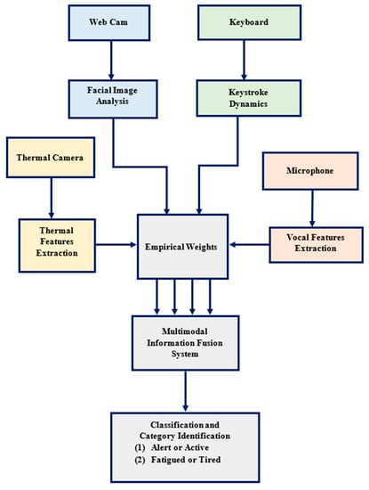 Empirical weights have been assigned to the features to improve the classifier’s accuracy. Initially, we assigned 25% weight to all the domains. Afterward, we applied the optimization technique to assign the weights to achieve maximum classification accuracy. We assigned 29% for visual spectrum image analysis, 37% for thermal spectrum image analysis, 16% for keystroke analysis, and 18% for speech analysis. For this proposed multimodal feature fusion technique, a threshold value is taken as 0.5. It implies that if the output of the proposed multimodal feature fusion technique is less than 0.5, then the subject is alert; otherwise, the subject is classified as fatigued.