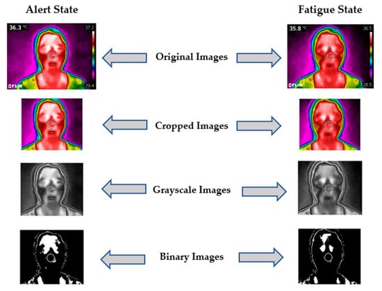 (b) Thermal Image Features: Overall, five features (listed in Table 2) are considered significant from the captured thermal images. The facial region is initially cropped and extracted from the image acquired from the thermal camera to extract the pixel count value. Then, the extracted thermal image of the facial region is converted into grayscale. Cropping the image and converting it to grayscale reduces the processing time significantly. Afterward, the grayscale image is transformed into a binary image, as shown in Figure 3.