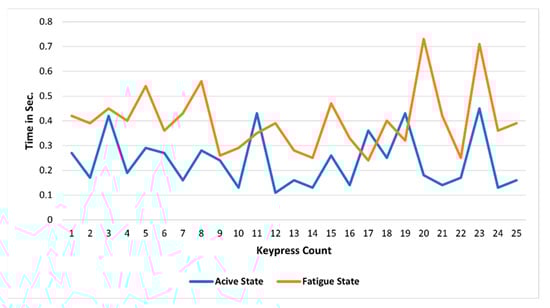 Reflex analysis is another way to detect fatigue by measuring reaction time. Fatigue contributes to slowing down the reflexes of a person, resulting in elongated reaction time. Analyzing a reaction time is straightforward, such as pressing a button in response to a visual stimulus, which can be used to measure reaction time. It is a promising approach having potential in research studies. L. M. Vizer et al. proposed a methodology to detect stressed subjects by monitoring the interaction pattern of a keyboard. Outcomes from their experimental study exhibit the possibility for stress classification through keystroking patterns []. Y. M. Lim et al. investigated the characteristics of keyboard and mouse activity to classify stressed subjects. They concluded that the keyboard and mouse behavior is affected due to the stress induced by time pressure and mental arithmetic problem []. In addition to this, Nahin et al. discussed an approach to detect a state of mind by analyzing keyboard typing patterns. The collective keystroke dynamics and text sequence analysis show 80% accuracy []. Hooda R et al. studied the necessity of real-time fatigue detection more accurately, including biological and physical features [].