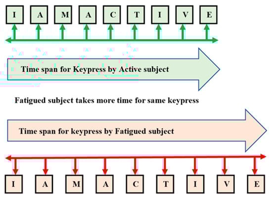 Different sentences of similar character length have been used in the experiment, i.e., around 48 to 54 characters, considering space keypress. The purpose of distinct sentences is that the individual does not become habitual to typing one sentence every time. The second feature is the difference in characters; this feature is measured by calculating the total number of mismatches between the string displayed on the screen and the string entered by the subject using a keyboard. Each character is compared one by one with the preliminary assumption that the subject is prone to make mistakes if the subject is exhausted. In contrast, the errors attempted by an active subject will be negligible. The third feature is the ASCII difference; here, the preliminary assumption is that sometimes the subject is alert, but characters’ sequence changes may occur while typing a sentence in a hurry. There will be no difference in ASCII values of that particular sentence in such cases. The fourth feature is the total time taken by an individual to enter a sentence or string, i.e., whole string time, as shown in Figure 5. Let us take a string, “With the new day comes new strength and new thoughts”, as an example. This particular string consists of 52 characters, including the space keypress. If the subject is fatigued, he will take more time within the keypress. Further, there are chances he will make some spelling mistakes. Suppose the subject is alert and makes spelling mistakes, which can be detected by the characters’ differences in the ASCII value. If the subject is alert, there will be no ASCII difference. Further, the fatigued subject takes more time to complete all the keypresses than the alert subjects.