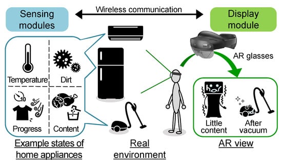The system consists of sensing modules which acquire the state of the home appliances and a display module to visualize the state through AR glasses. We can utilize sensors embedded in the home appliances if available or retrofit a sensing module to obtain information that is not available through the home appliances themselves. These sensing modules periodically acquire information such as temperature, cleanliness, and remaining consumables and send it to the display module through wireless communication such as WiFi or Bluetooth. Note that the system architecture here is simple and abstract. In reality, a sensor module may consist of multiple sensor devices and a computer that infers a high-level state from multiple low inputs. We are primarily interested in the user’s response to the home appliance agents under a hypothetical situation where the state recognition is accurate. The actual implementation of sensing modules is out of the scope of this research.