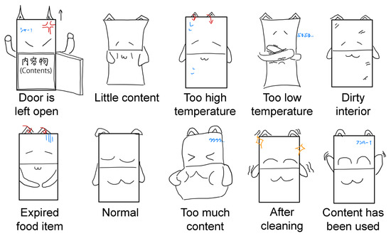 We selected three regular states (Normal, Full, Joy) and five irregular states (Open, Empty, Hot, Dirty, Expired) through the focus group discussion in Section 4. Figure 3 illustrates the AR visualizations corresponding to the five irregular states. Normal is a state in which there is no problem. Full is a state in which there is much content. Joy is a state in which it has recovered from an irregular state. Open is a state in which the door is left open. Empty is a state in which there is little content. Hot is a state in which the internal temperature is too high. Dirty is a state in which the interior is dirty. Expired is a state in which it contains an expired food item. In the Dirty and Expired states, the agent’s arms scrub around the corresponding position.