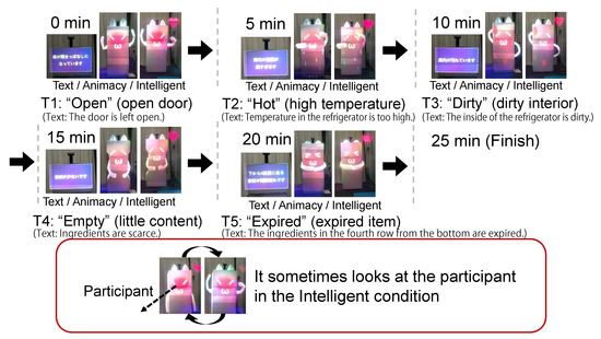 We hypothesized that generating animacy perception in a home appliance will reduce the user’s discomfort. In order to further reduce discomfort, it is preferable to be able to start working on the home appliance at a time desired by the user. Furthermore, it is not desirable for the problem to be ignored for a long time. It is thus important to have an appropriate guiding effect that makes the user want to start the maintenance work at an appropriate time without feeling a sense of coercion. Examples of appropriate timing include when a user finishes reading a book chapter or stops studying due to a difficult problem.