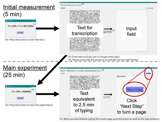 As we wrote in Section 5.2, the participants were asked to perform a transcription task of a novel (“I am a Cat” by Soseki Natsume (https://www.aozora.gr.jp/cards/000148/files/789_14547.html, accessed 19 March 2023)) spanning many pages shown on a desktop monitor in parallel with the refrigerator maintenance task. The novel was selected for its plain writing and simple kanji characters used. They transcribed the text presented on the left side of the monitor to its right side. The number of words transcribed by each participant was adjusted so that a page turn would occur at least once per instance of the irregular states (T1–T5). In the first five minutes of the experimental task, no problem occurred in the refrigerator and the typing speed of the participant was measured by the transcription interface shown in Figure 4 (top). In the subsequent transcription task that lasted for 25 min, text equivalent to 2.5 min of typing was shown per page based on the initial typing speed (see Figure 4 (bottom right)). The participants needed to click the “Next Step” button to proceed to the next page every time they finished transcribing the displayed text. The “Next Step” button appeared only after more than 90% of the text had been entered to avoid double clicking. While we instructed them to transcribe the text as accurately as possible, no error was checked and they could proceed with the task with imperfect transcription.