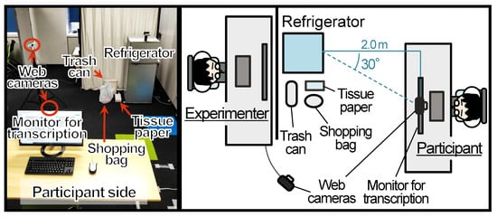 In order to accomplish the maintenance task, a few items (a trash can, tissue paper, and a shopping bag) were placed on the left side of the refrigerator. The refrigerator (SHARP SJ-H12Y, W480 × D480 × H1150 mm) was positioned 2.0 m behind and 30 deg to the right of the desktop monitor for the transcription task. The experimenter sat behind the refrigerator and a partition so that they were not visible to the participants. They watched the participants through a web camera and changed the refrigerator states to conduct the WoZ experiment.