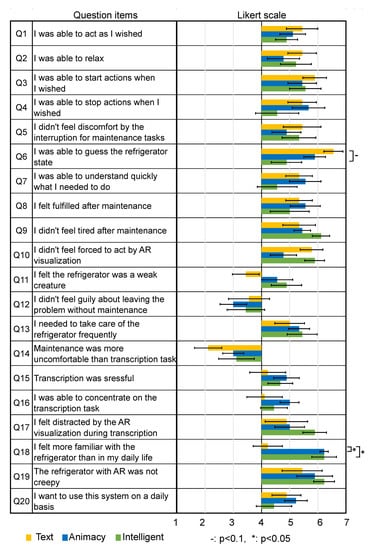 Regarding the original 20 questions, Wilcoxon’s rank sum test and the BH correction method found statistically significant differences between the Text and Animacy conditions () and between the Text and Intelligence conditions () only in Q18 (“I felt more familiar with the refrigerator than in my daily life.”). Wilcoxon’s rank sum test and the BH correction method also found a trend toward significance () between the Text and Intelligence conditions in Q6 (“I was able to guess the refrigerator state.”). No statistically significant differences were found between the Animacy and Intelligence conditions in any questions.