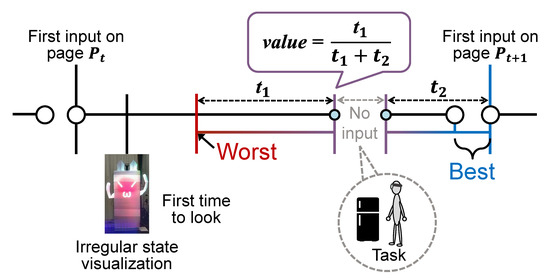 We evaluated the action timing of the maintenance task as an indicator of the sense of coercion. Our hypothesis was that the participants would start the maintenance task at the time of a page turn if they were feeling little pressure and they were focusing well on the transcription task, and that they would start the maintenance task as soon as they noticed the AR visualization if they were feeling much pressure and they were not focusing on the transcription task. Thus, we calculated the action timing value for each irregular state by Equation (2) from the time interval (from the first gaze at the refrigerator to the start of the leaving the seat) and the time interval (from the end of leaving the seat to the end of the transcription task on that page) as shown in Figure 7. Our assumption was that the higher the sense of coercion, the lower this value would be.