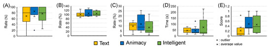 As our emphasis is on how the participants respond to the state visualization, it was considered an unsuccess if they misunderstood what to do on the state visualization or solved a different problem other than what was being visualized. In such a case, the recovery state (Joy) was not presented. Figure 8A shows the success rate for each condition. In the Text condition, we observed that many participants ignored the state visualizations and did not act on them. In the Intelligence condition, we observed that many participants looked at the state visualizations and acted on them, but gave up or solved another problem because they did not understand what they needed to do. Figure 8B shows the relative change of the LF/HF ratio from the baseline to that during the main transcription task for each condition. Regardless of the condition, it was higher than 100% for most of the participants, suggesting a higher stress level. Figure 8C shows the percentage of time in which the participants were looking at the refrigerator while seated for each condition. Figure 8D shows the time interval between the beginning of each irregular state visualization to the start of the leaving the seat for each condition. Figure 8E shows the action timing values calculated by Equation (2). Welch’s t-test and the Benjamini–Hochberg (BH) correction method did not find any statistically significant differences in any condition pair in any of these five evaluation metrics.