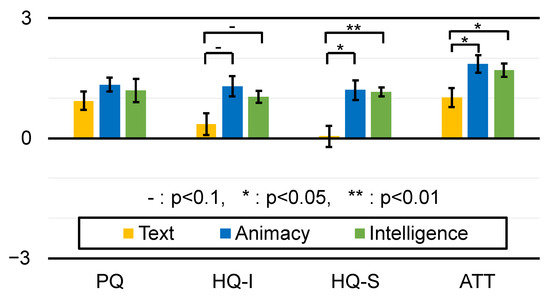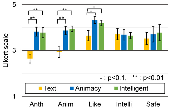 Figure 9 summarizes the results of AttrakDiff in each category, Figure 10 summarizes the results of the Godspeed Questionnaire in each category, and Figure 6 shows the results of the original 20 questions. In these figures, the ratings are considered interval scales for simplicity. The error bars indicate the standard error.