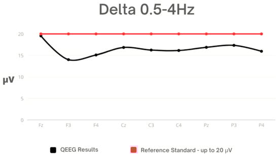 Based on the results of quantitative electroencephalography with closed eyes, it can be suggested that the values measured in this manner should be lower. Closing the eyes induces changes in brain activity. When we close our eyes, we significantly reduce the amount of sensory stimuli we receive from the environment, which can lead to a decrease in brain activity in some areas. One of the areas that may undergo changes is the occipital area, which is associated with visual processing. With closed eyes, this area may show lower activity. Additionally, closing the eyes induces a state of rest, which also affects the decrease in brain activity. However, it should be noted that QEEG results with closed eyes are important for assessing the resting state and can provide information on brain activity in such a state [,].