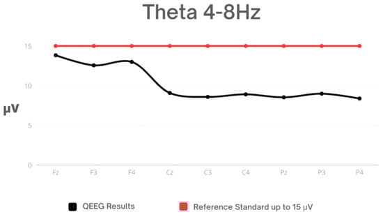 The highest average Theta activity was observed in Fz, while the lowest average activity was noted in P4. Standard deviations also differed across different electrode locations, with Fz having the highest, indicating greater variability in Theta activity for this region. The average values were within the reference range. However, the recorded maximum values in the FZ, F3, and F4 leads were outside the reference range (Table 3, Figure 2).