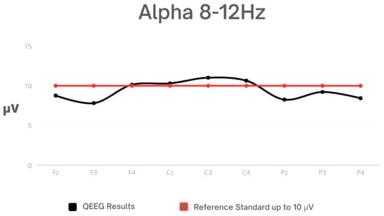 In the present study, high values were recorded for Alpha waves in CZ, C3, and C4 leads, which exceeded the reference norm. The results of the present study suggest that high values were recorded for Alpha waves in certain leads, indicating a state of relaxation with closed eyes. This is in line with previous research in which it has been shown that the amplitude of Alpha waves usually increases during relaxation, which is characterised by a decrease in visual activity and a greater focus on one’s own thoughts [,]. Alpha waves appear in the temporal region on the right side of the brain. Their level increases not only during creative tasks but also in a relaxed state. They stimulate dreams and promote inspiration. Sharpened alpha waves in the occipital region indicate deep relaxation. Alpha waves are also present in the frontal lobe. When they are present and repetitive, they can cause anxiety, indicating that the patient is under tension, perhaps before facing a challenge. Too low levels of alpha waves can cause sleep problems, generate fear, and anxiety. Conversely, when alpha waves are too high, we have difficulties concentrating and feel a lack of energy. Numerous studies report that alpha rhythm largely depends on age and gender []. However, it is important to consider that individual differences may affect the results, such as age, gender, health status, medication, stress, and fatigue [,,]. During sports competition or training, athletes are exposed to a high level of stress and physical exertion, leading to muscle tension and emotional tension. When an athlete closes his/her eyes, it can help relax and reduce muscle tension, which can lead to an increase of Alpha waves in the brain. This can be beneficial for athletes, as relaxation and reduced muscle tension can lead to better performance and improved overall well-being []. Higher levels of the alpha band improve heart rate variability, which is associated with lower levels of anxiety and stress []. It is worth noting that Alpha wave activity can also vary depending on the athlete’s level of experience. In a study on experienced karate athletes, lower levels of Alpha wave activity were associated with greater efficiency in processing sensory information. This suggests that experienced athletes may have developed a more efficient neural network for processing sensory information, leading to a different pattern of brain activity during competition or training [].