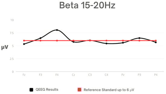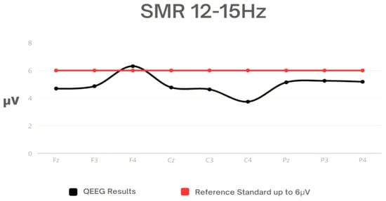 In the analysis carried out in the current study, an increase above the reference norm in the sensomotoric SMR waves in electrode f4 has been shown. Sensomotoric rhythm (SMR) is a type of brainwave that occurs within the frequency range of 12–15 Hz. It is primarily found in the sensory and motor areas of the brain and is associated with the activation of the motor cortex. SMR waves are used in biofeedback training as a measure of relaxation and concentration levels, and athletes can use biofeedback training to improve their physical and mental performance. The biofeedback training process involves the athlete learning to control their physiological responses, such as heart rate, breathing, and brainwave activity, achieving a desired state of relaxation or concentration [,]. Therefore, increased SMR may indicate that the athletes were in a state of full relaxation.