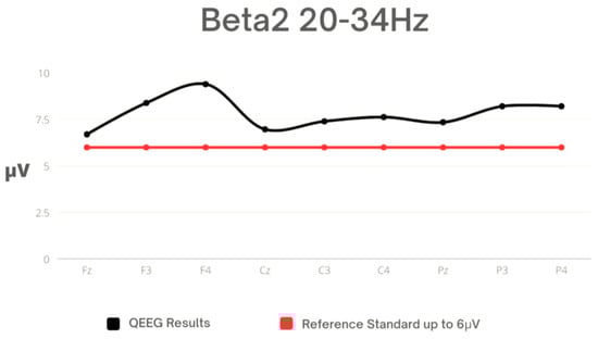 In Table 7, the characteristics of Beta2 waves are presented. The highest activity was observed in the frontal lobes of both the left and right hemispheres, while the lowest was noted in the central frontal lobe. The values for all electrodes exceeded the reference range (Figure 6).