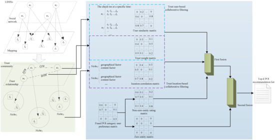 In LBSNs, a personalized POI recommendation aims to recommend unvisited POIs to targeted users in terms of users’ historical check-ins [2,3], which is of great significance in the realization of a smart city. This is because the received recommendation results are beneficial for users’ personalized demands, users’ behavior trends or trajectory predictions, as well as certain traffic fields related to users’ behavior trends. However, to accurately predict whether a personalized user will visit a specific location at a specific time based on historical check-ins, it is a critical challenge to cope with the issue of data sparsity and trustworthiness. For example, in real-world Gowalla and Foursquare datasets, the user-POI checking-in density is 0.291% and 0.385%, respectively, and the user-POI rating matrix contains some noise [4,5], i.e., fake ratings and malicious feedbacks.