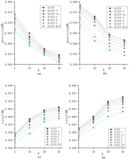 Furthermore, we evaluate the performance of all models with top-k recommendation results in the dimension , . The experimental results are shown in Table 4. Evidently, with the increase in k, each model shows a trend of decreasing and increasing . The reason is that more POIs recommended to users contain more user preferences, while the POIs which may be visited will reduce. Specifically, the models integrating fewer context factors, i.e., ASMF and TA, are inferior to the models fusing more context factors, i.e., ST-RNet, SSTPMF, and BiTCF. Among the trust-enhanced models, TECF outperforms SPTW, and both are inferior to BiTCF. This is because BiTCF performs more sufficient trust filtering from the views of users and locations using various factors.