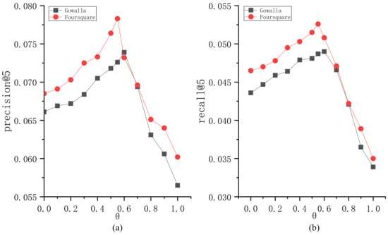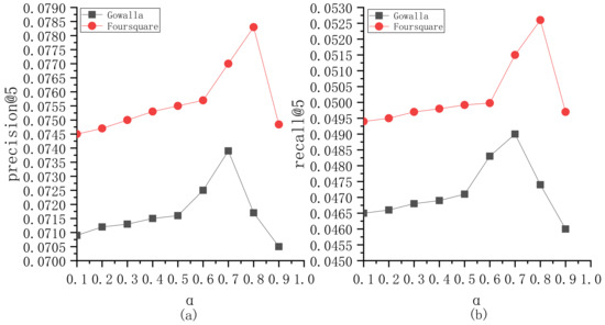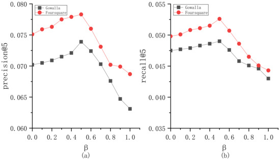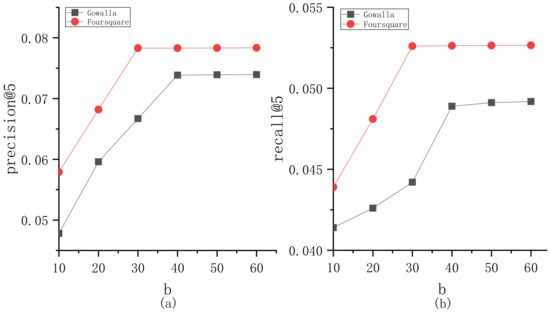 We tune the parameters by employing the grid search used in [6,8,17] and set different parameter values for the baselines on two datasets to achieve their best performance. In BiTCF, we set the required parameters as , and . We tune the parameters by employing grid search to confirm the optimal settings on two datasets, including in , in , in , in , in , in , as well as , and in . Finally, on Gowalla, the optimal settings are , , , , , , , and . On Foursquare, the optimal settings are , , , , , , , and .